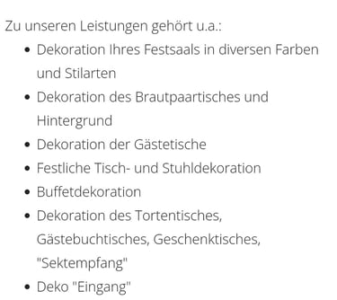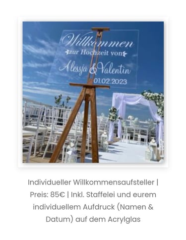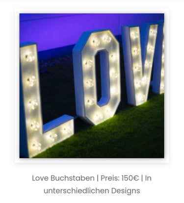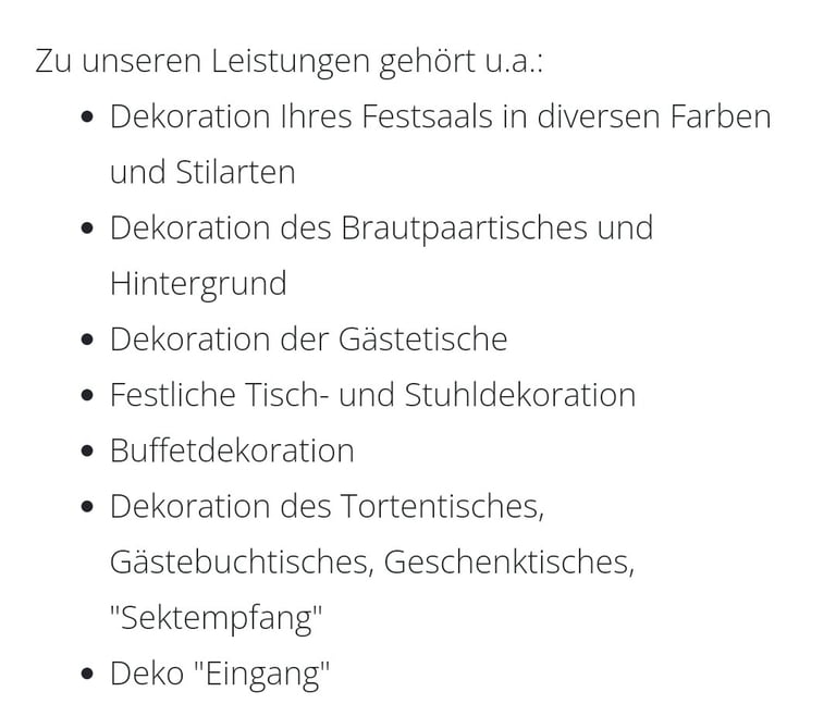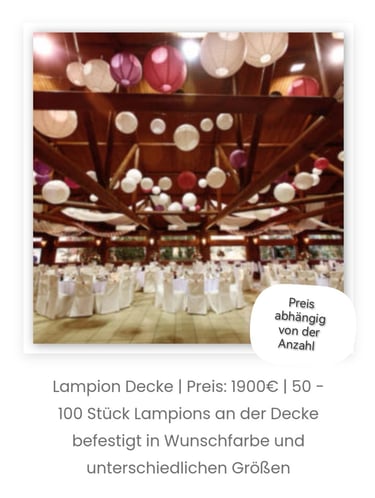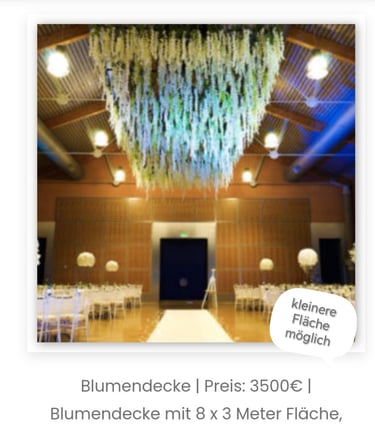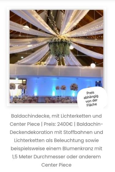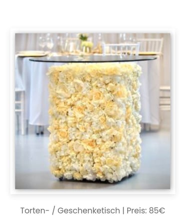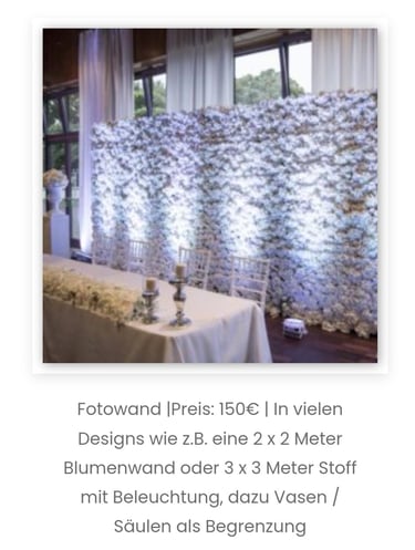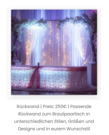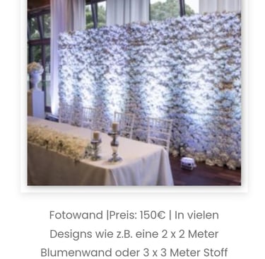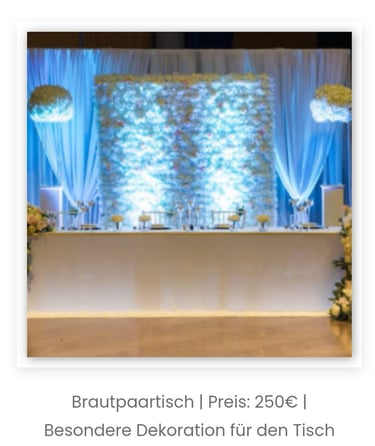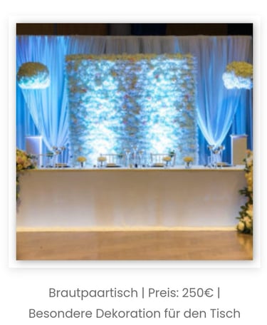 Wir bieten professionelle und wunderschöne Hochzeitsdekoration an. Unser Service umfasst die Lieferung, den Aufbau und den Abbau der Dekoration. Mit unserer Erfahrung stehen wir Ihnen gerne beratend zur Seite. Wir verstehen, dass eine Hochzeit ein besonderer Tag ist und möchten dazu beitragen, dass er unvergesslich wird. Unsere Dekorationen sind sorgfältig ausgewählt und werden mit viel Liebe zum Detail gestaltet. Egal, ob Sie eine romantische, moderne oder traditionelle Hochzeit wünschen, wir finden die passende Dekoration für Ihren Geschmack. Vertrauen Sie auf unsere professionelle Arbeit und lassen Sie Ihre Hochzeit mit unseren Dekorationen erstrahlen.